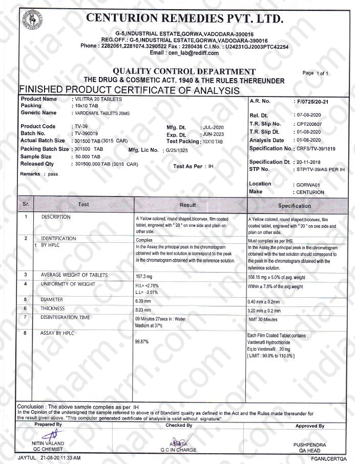 | Название препарата | Lovevitra 20 (Vardenafil Tablets 20 mg) |
