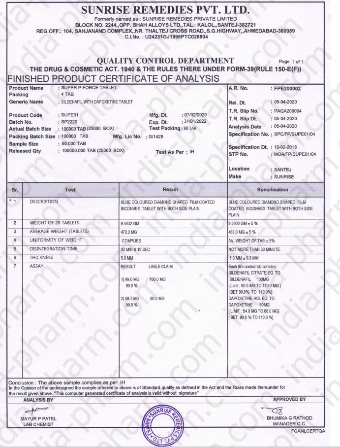 | Название препарата | Super P Force (Sildenafil & Dapoxetine Tablet) |