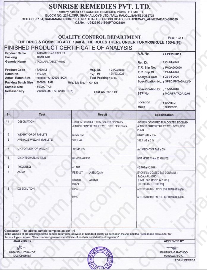 | Название препарата | Tadarise 40 (Tadalafil Tablets 40 mg) |