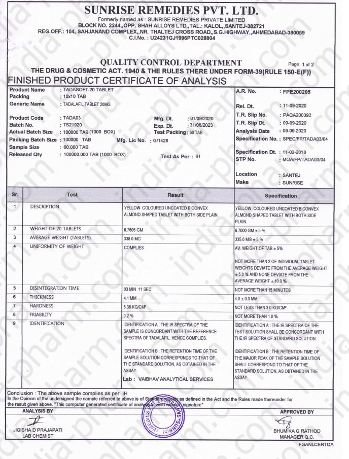 | Название препарата | Tadasoft 20 (Tadalafil Tablets 20 mg) |